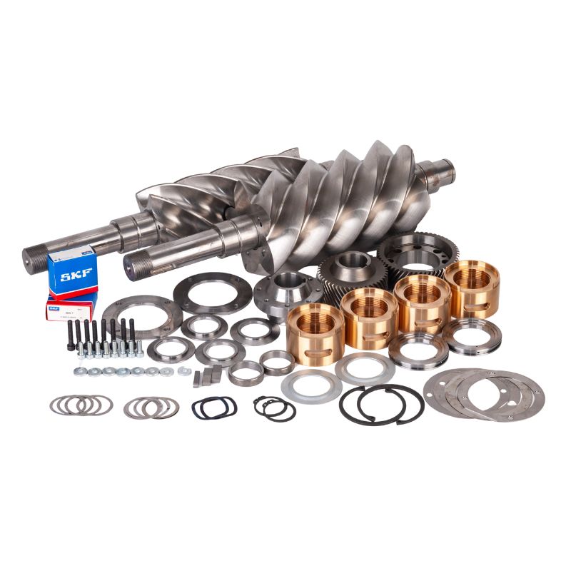It contains a new, factory-matched pair of screw rotors, precision bearings (SKF), bronze bushings, gears, spacers, shims, seals, O-rings and the necessary bolts and washers. Using original Mouvex components ensures perfect compatibility, correct clearances and optimal compression efficiency after the rebuild.