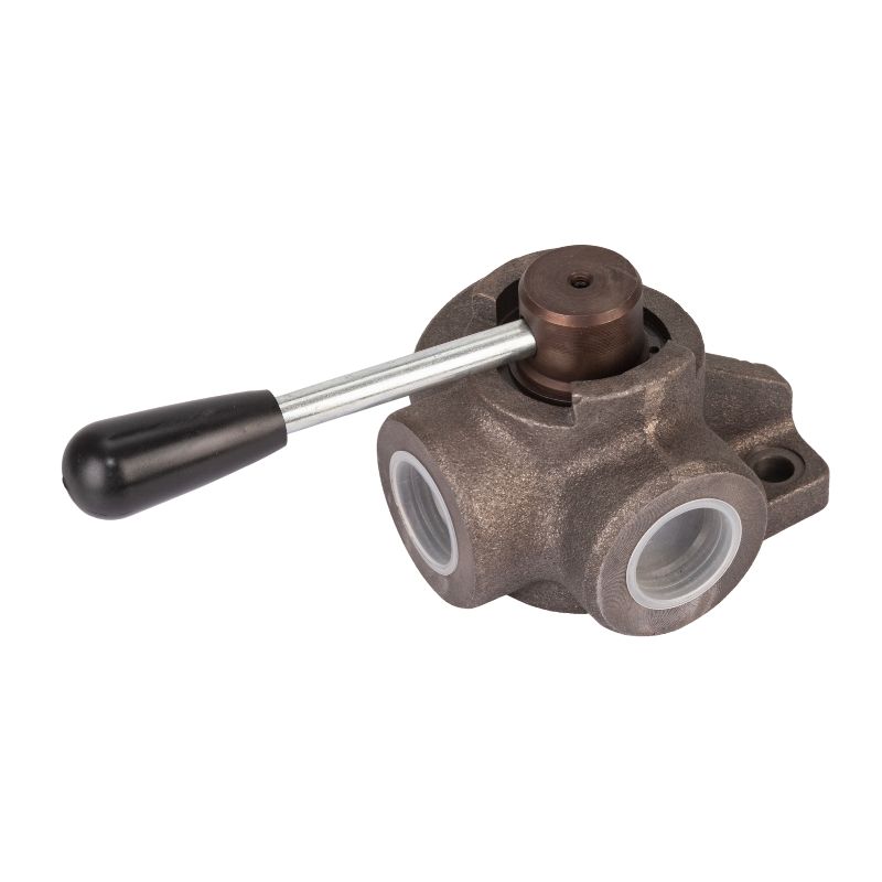 Manual 3-way valve for switching hydraulic flow between circuits. Rugged cast iron body, lever operated.